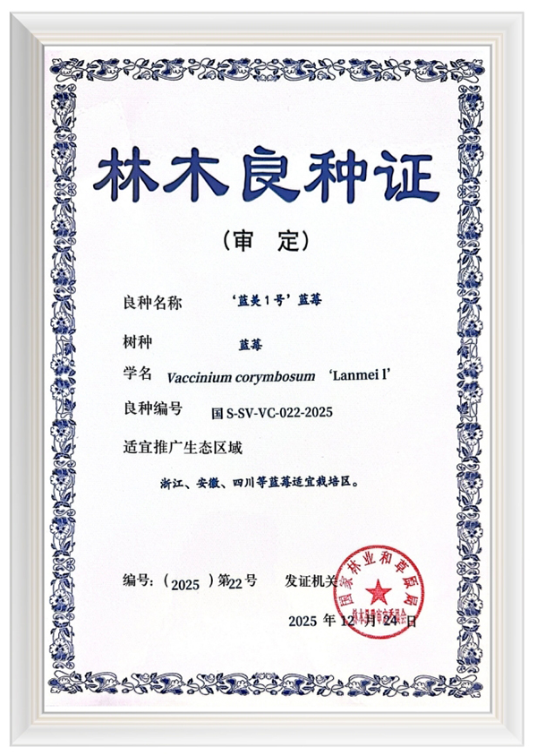 联合江苏省中科院植物研究所、浙江省农业科学院等机构,历经多年攻关培育出“蓝美1号”。该品种抗逆性强、成活率超95%,亩产达2000—5000斤,花色苷含量为普通蓝莓的8—10倍,是中国蓝莓产业化栽培的代表性新品种,彻底摆脱对国外种源的依赖。公司已建成1700余份蓝莓种质资源圃,持续推进品种迭代创新。
