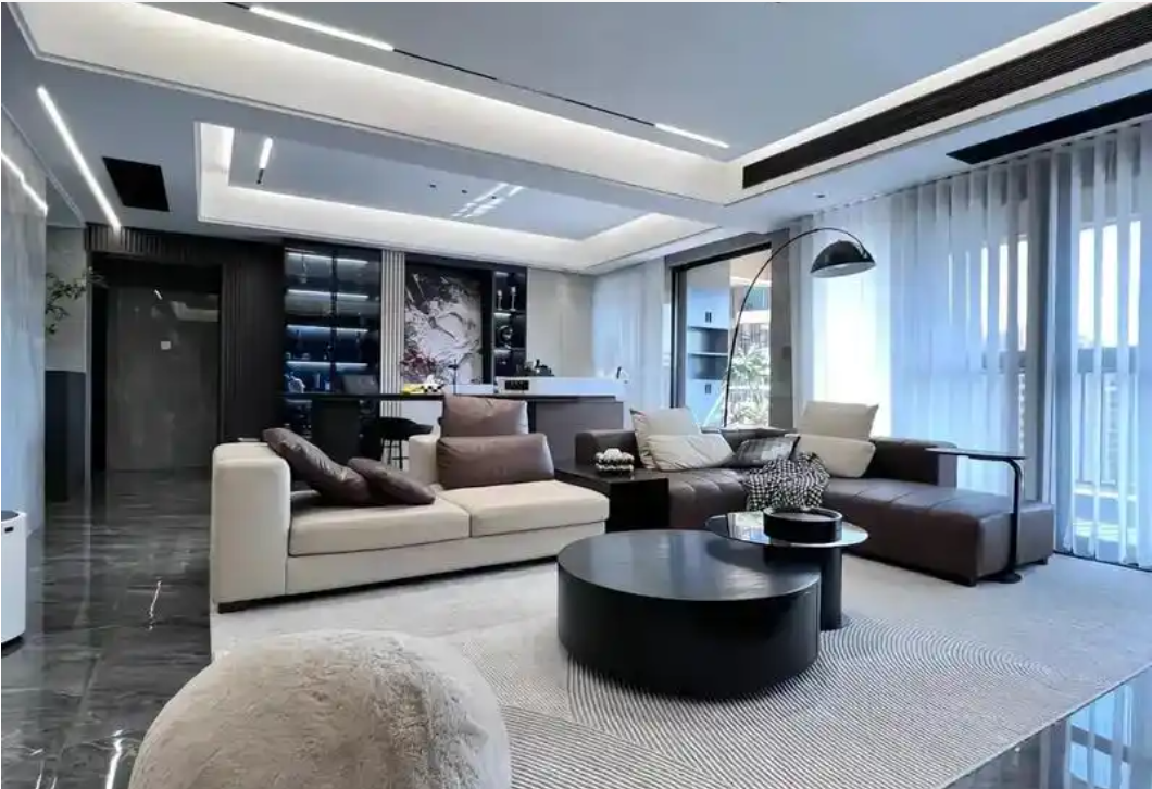 但在这个空间里,设计师以随性而巧妙的方式打破常规。从玄关处开始,浓厚的艺术氛围便渗透到每个角落。复古风格的雕塑以其深邃的形态与时光感,与功能设计完美契合,成为空间的艺术点缀。客厅的布局简洁大气,空间的流动感增强了居住者的舒适感。宽敞的布局不仅让活动更加自由,更营造了放松心情的氛围。